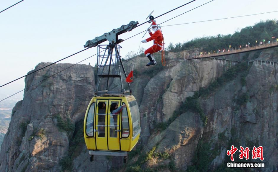 One member of the scenic spot staff, dressed like Santa Claus, climbs the cable car to send gift to visitors for celebrating the up-coming Christmas in China's Hunan Province. (Photo source:chinanews.com)
