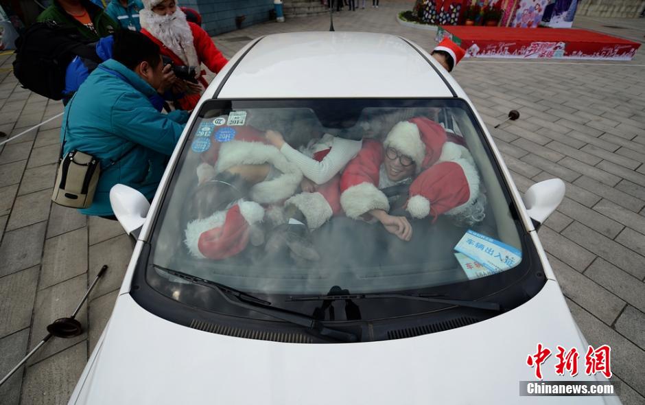 To welcome the Christmas, a fun competition is held at the theme park “Window of the World” in Changsha, central China’s Hunan province on Dec. 18, 2014. Altogether 19 “Santas” squeezed in one car, leaving the audience in amazement. (Chinanews/Yang Huafeng)