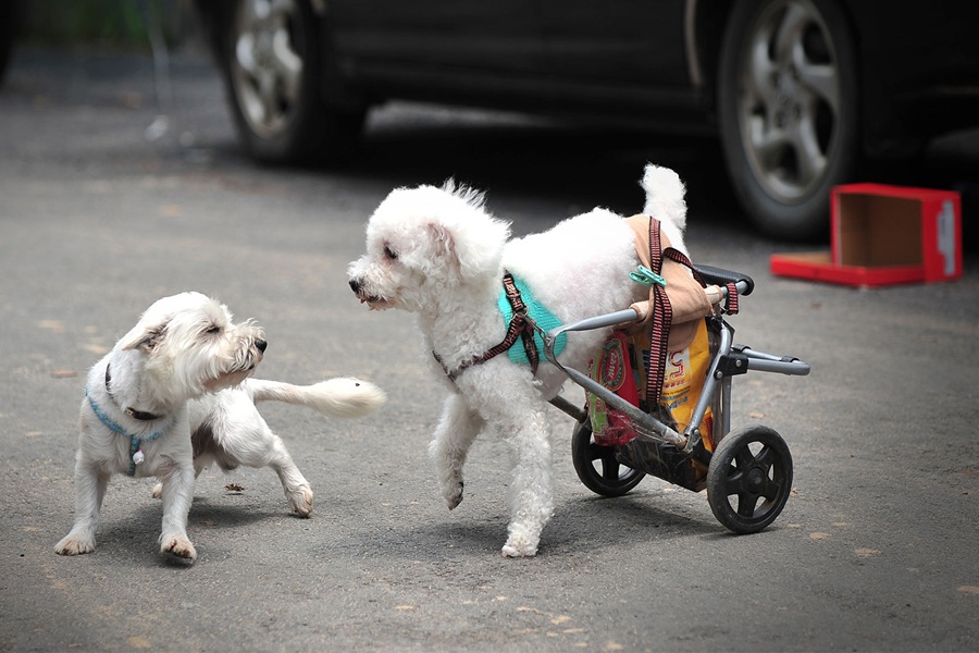 A disabled poodle sits in the wheelchair made by its owner. It played with another dog happily and always turns back to wait its owner. (Photo/People's Daily Online)