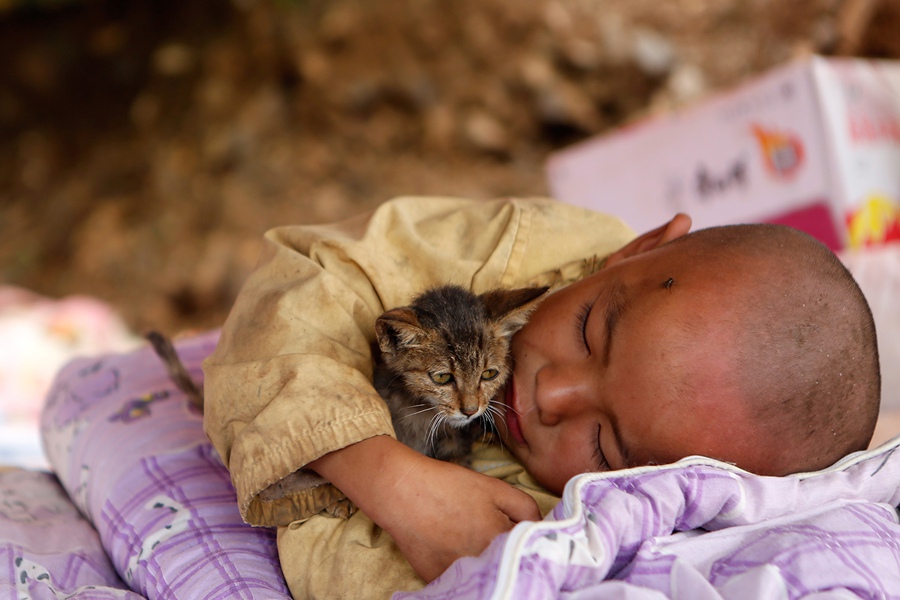 The rescued child sleeps with a cat in the shelter in quake-stricken Ludian, Yunnan province. (Photo/People's Daily Online)