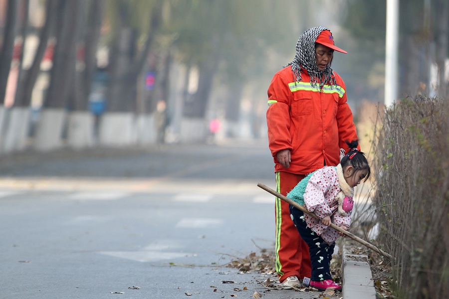 Ying Ying, a three-year-old girl, helps her grandmother to clean the road. Her grandmother is a hard working sanitation worker. (Photo/People's Daily Online)