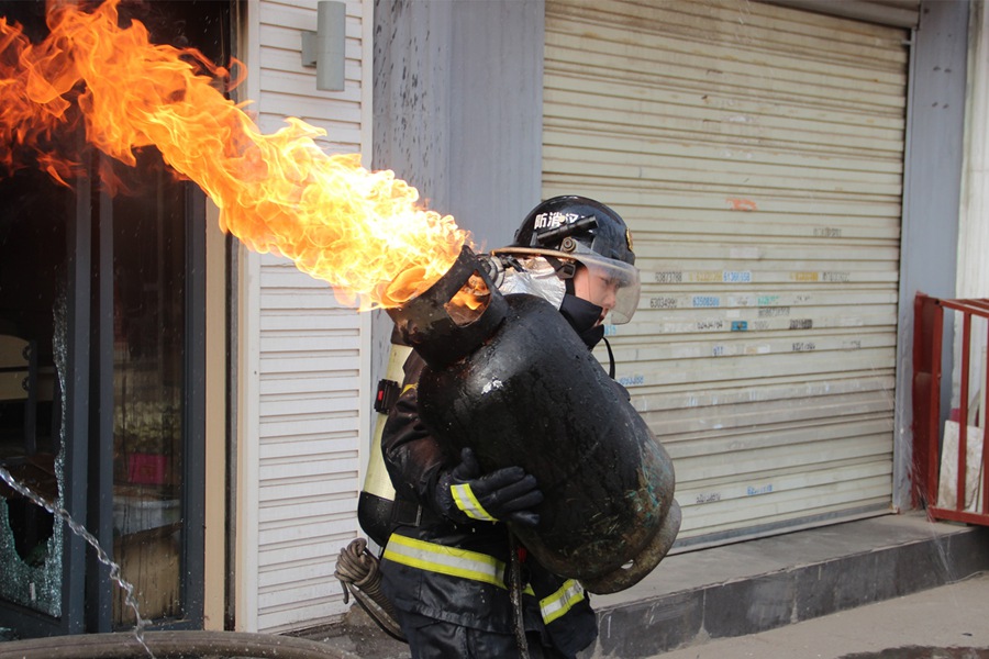 A fireman runs out of the fire ground, holding a burning gas tank regardless of the possibility of explosion. Some netizens thought that he took a risk with his life. He told us that he was a fireman. (Photo/People's Daily Online)