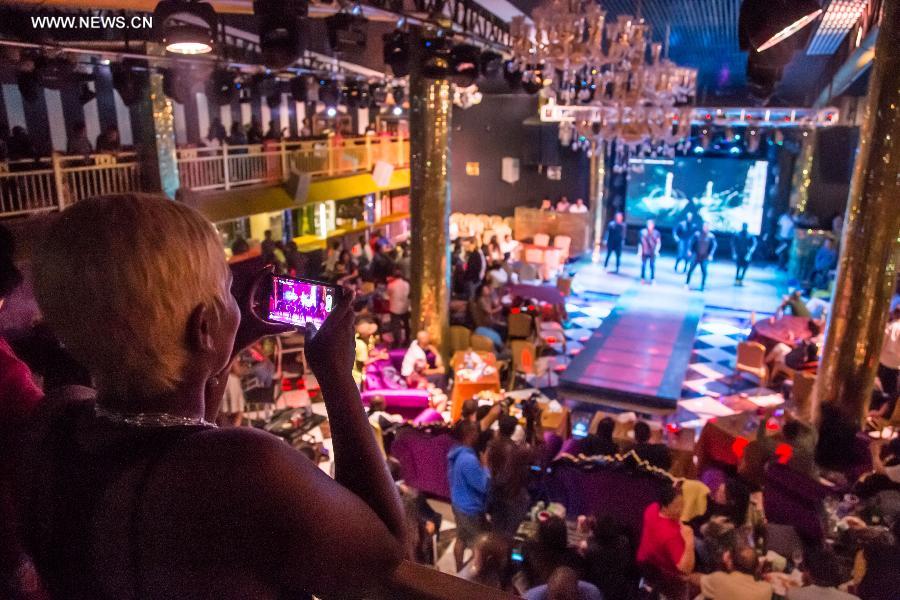 | A Zimbabwean takes a shot of the performance at a Christmas party in Harare, Zimbabwe, Dec. 22, 2014. The Chinese Federation of Zimbabwe on Monday organized a Christmas party themed "We are together" in western suburbs of Harare to bring Zimbabweans and Chinese together in celebrating the Christmas holiday that begins this week. (Xinhua/Xu Lingui) |