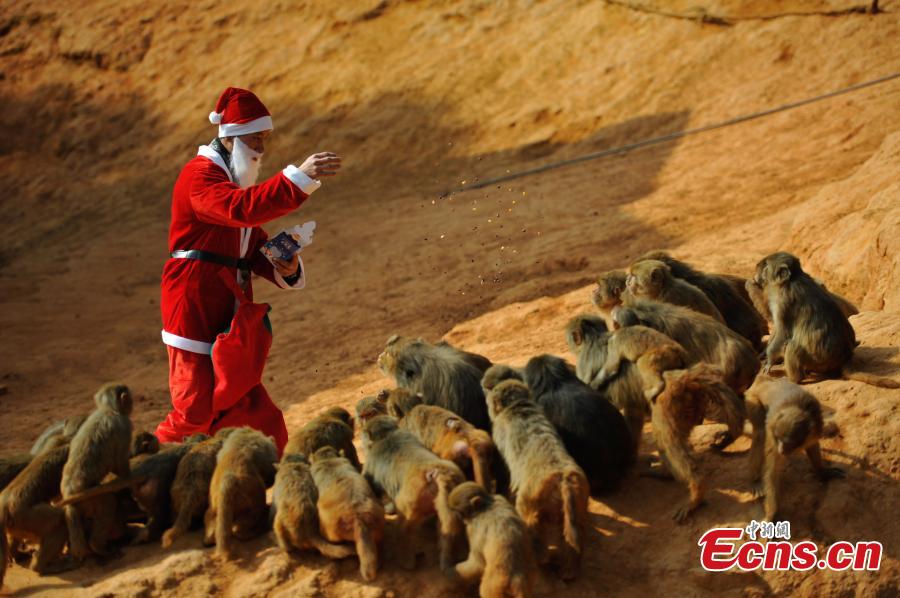 A zookeeper dressed as Santa Claus feed monkeys at the Yunnan Wild Animal Park in Kunming, Yunnan province on December 22, 2014. [Photo: China News Service/ Liu Ranyang]