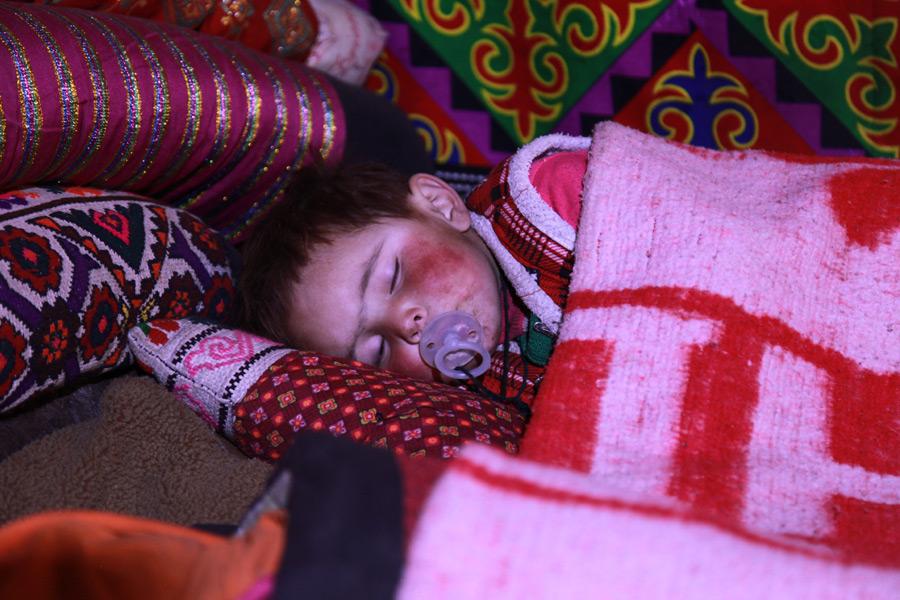Gulaxiami sleeps covered with a colorful blanket. [Photo by Wang Lie/chinadaily.com.cn]