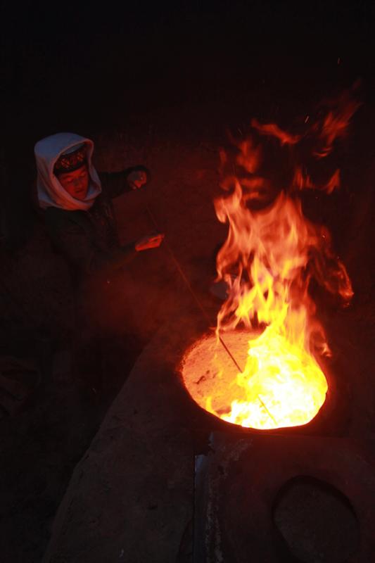 A Tajik woman makes a fire in a hand-made clay pit. [Photo by Wang Lie/chinadaily.com.cn]