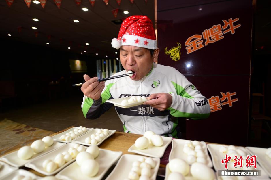 Pan Yizhong takes part in a Christmas challenge and eats up 150 boiled quail eggs and 10 boiled chicken eggs in 37 minutes. (CNS/Yang Huafeng)