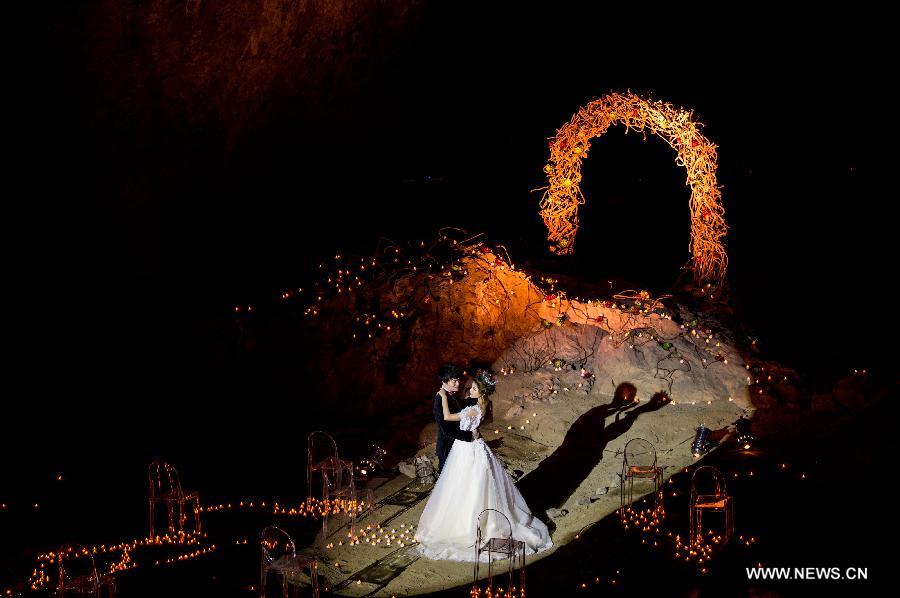 A couple dance during their wedding ceremony at a karst cave in Chongqing, southwest China, Dec. 24, 2014. (Xinhua/Liu Chan)
