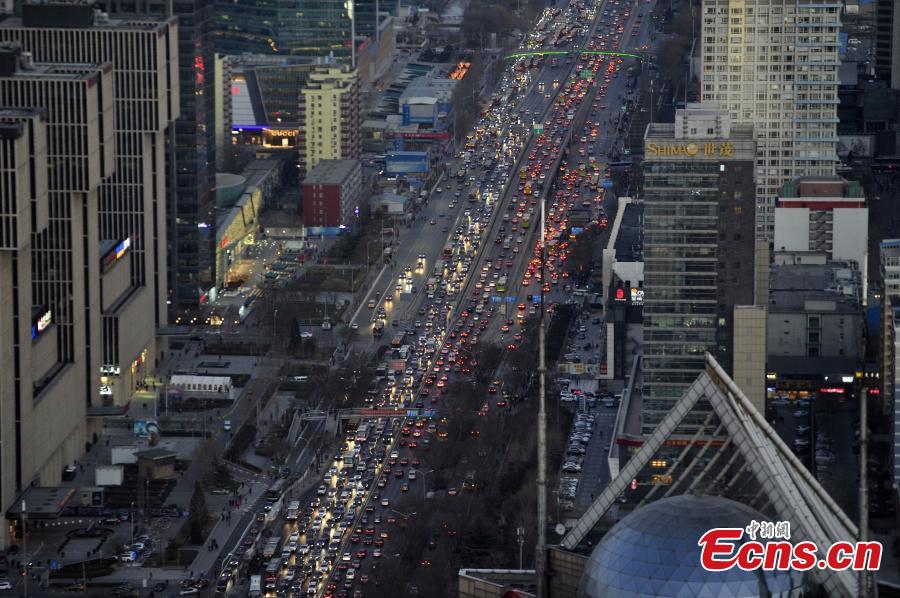 A traffic jam is pictured on roads at the 2nd Ring Road in Beijing, capital of China, Dec. 24, 2014. As Christmas Day draws near, congestion in the capital is expected to reach a peak. (China News Service/Wei Xi)