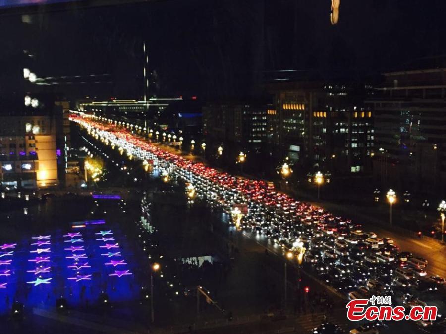 Lines of cars are pictured during a rush hour traffic jam along Chang'an Avenue of Beijing, capital of China on December 24, 2014. As Christmas Day draws near, congestion in the capital is expected to reach a peak this week. (China News Service/Wei Xi)