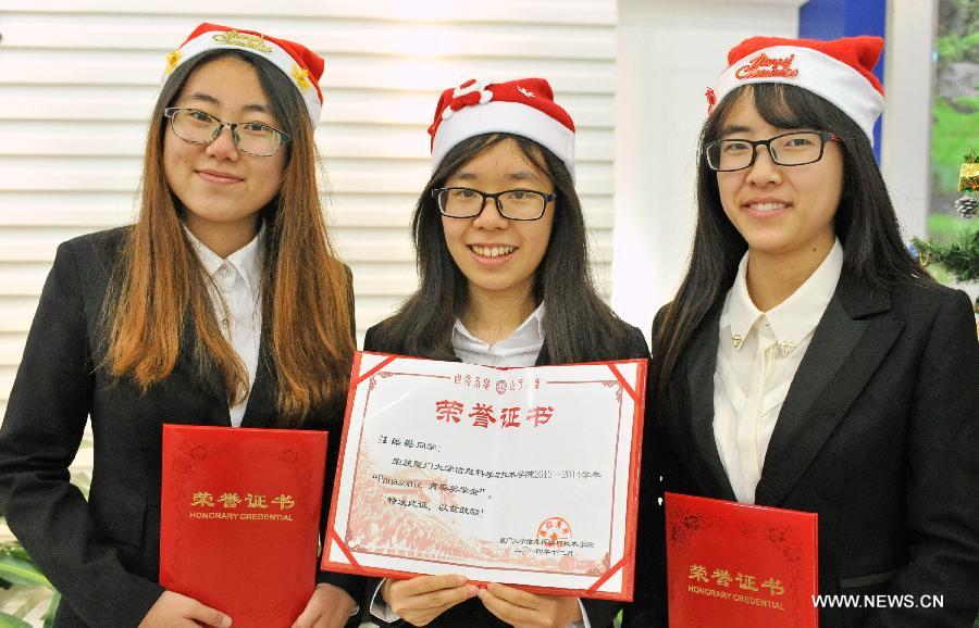 | Students show their credentials of scholarship at Xiamen University in Xiamen, southeast China's Fujian Province, Dec. 25, 2014. Ten students of the university were rewarded scholarships provided by Panasonic on Thursday. (Xinhua/Lin Shanchuan) |