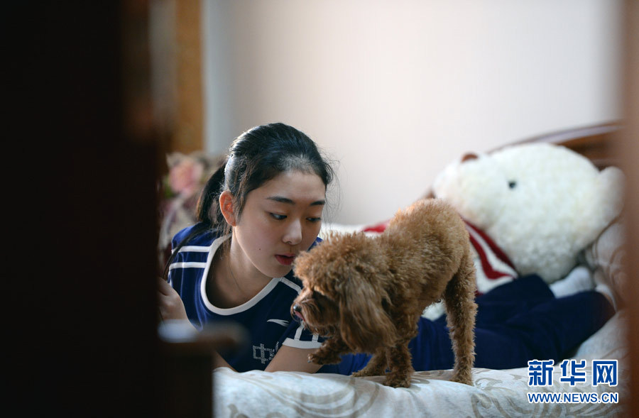Li Zijun plays with her dog (Xinhua/Lin Hong)
