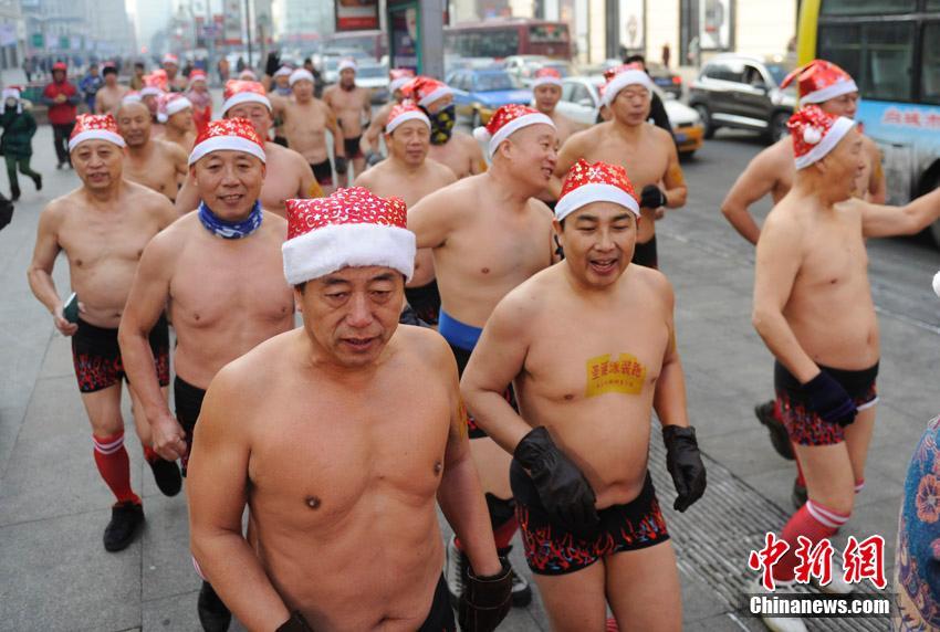 Citizens, braving the cold, participate in a swimsuit run in Changchun, northeast China's Jilin province on Dec. 24, 2014, to celebrate Christmas. (CNS/Zhang Yao)