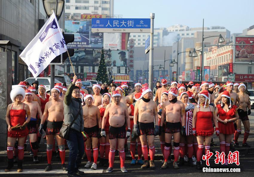 Citizens, braving the cold, participate in a swimsuit run in Changchun, northeast China's Jilin province on Dec. 24, 2014, to celebrate Christmas. (CNS/Zhang Yao)