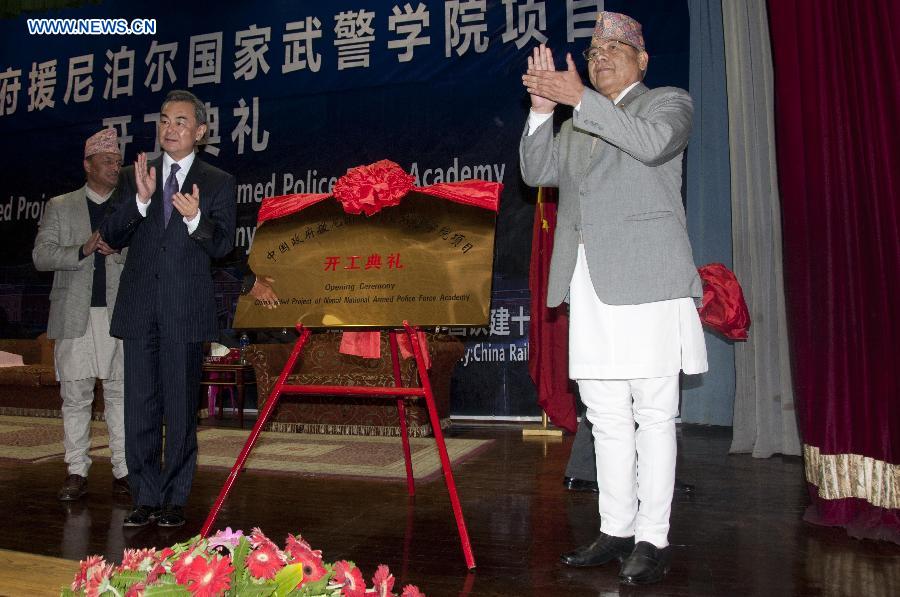 | Chinese Foreign Minister Wang Yi (2nd L) and Nepalese Deputy Prime Minister Bam Dev Gautam (R) jointly inaugurate the construction of Armed Police Force Academy at Halchowk in Kathmandu, Nepal, Dec. 26, 2014. (Xinhua/Pratap Thapa) |