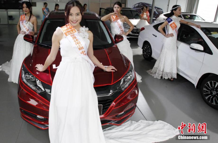 Seventy contestants of Miss Leisure 2014 take part in public service activities and pose for pictures in south China's Guangdong province on Dec.18, 2014, during visits to an auto show and a tour along the Pearl River. (China News Service/Qian Xingqiang)