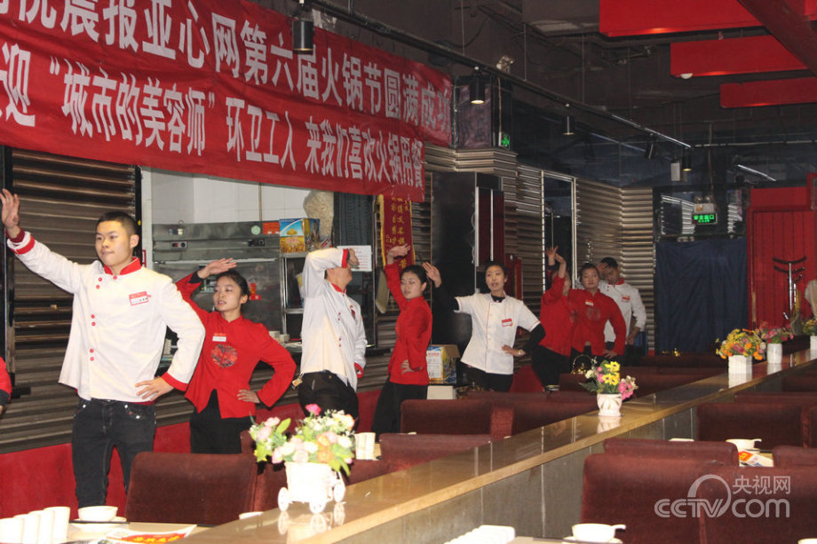 Workers at a hotpot restaurant perform for the sanitary workers.(cntv.cn/Ma Xu)