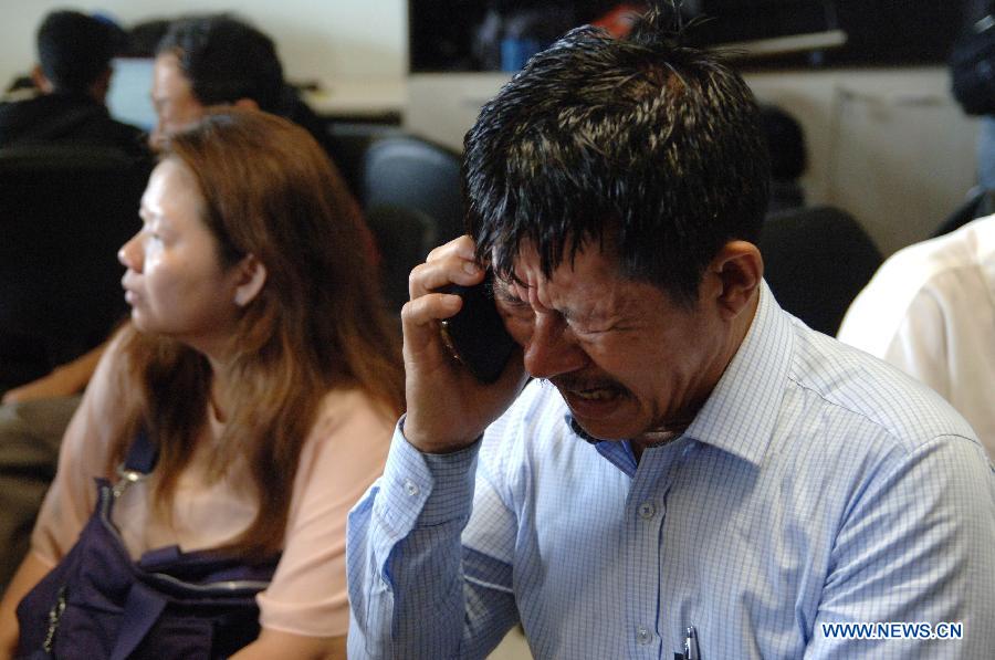 A man related to people onboard missing Malaysian air carrier Air Asia flight QZ8501 makes a phone call at Juanda international airport in Surabaya in East Java of Indonesia on Dec. 28, 2014. Air Asia Indonesia has released information about the 162 passengers and crew members onboard Flight QZ8501, which lost contact with the air traffic control Sunday morning. (Xinhua)