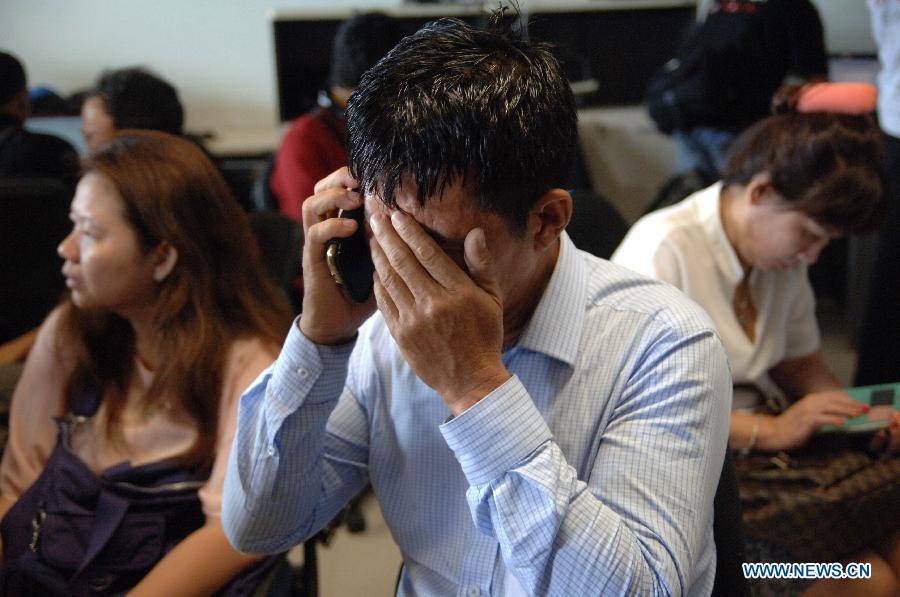 A man related to people onboard missing Malaysian air carrier Air Asia flight QZ8501 makes a phone call at Juanda international airport in Surabaya in East Java of Indonesia on Dec. 28, 2014. Air Asia Indonesia has released information about the 162 passengers and crew members onboard Flight QZ8501, which lost contact with the air traffic control Sunday morning. (Xinhua)