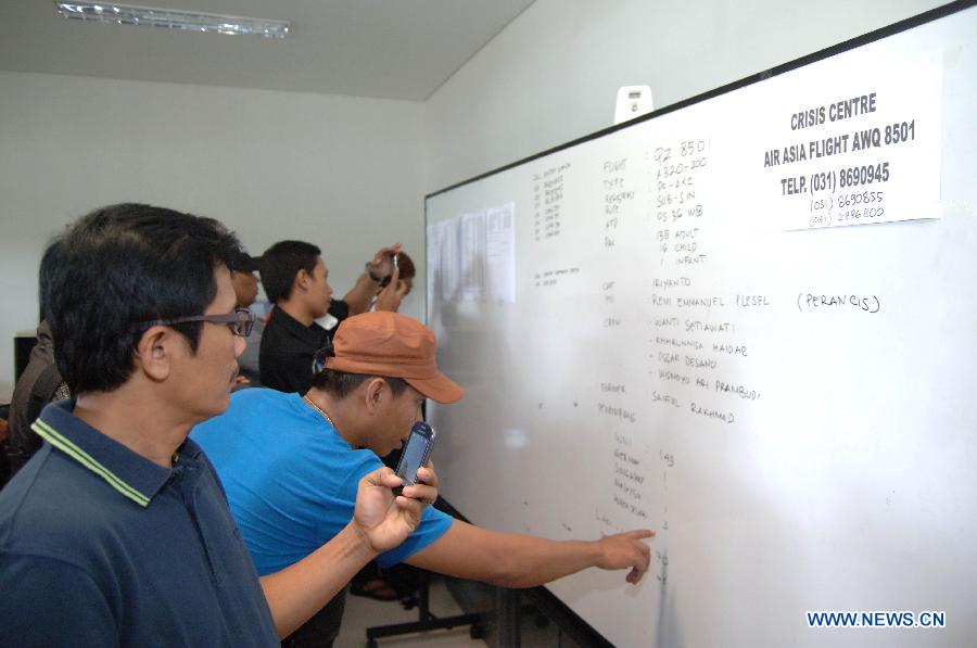 Family members of people onboard missing Malaysian air carrier Air Asia flight QZ8501 check information at Juanda international airport in Surabaya in East Java of Indonesia on Dec. 28, 2014. Air Asia Indonesia has released information about the 162 passengers and crew members onboard Flight QZ8501, which lost contact with the air traffic control Sunday morning. (Xinhua)
