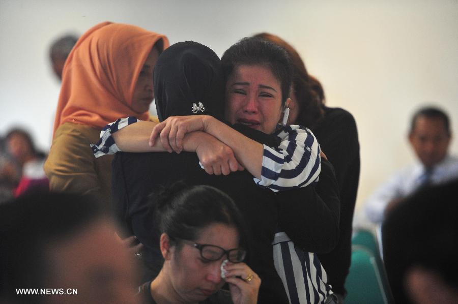 Family members of passengers on AirAsia Flight QZ8501 gather at Juanda International Airport in Surabaya, Indonesia, Dec. 29, 2014. Air Asia Indonesia has released information about the 162 passengers and crew members on Flight QZ8501, which lost contact with the air traffic control Sunday morning. (Xinhua/Zulkarnain)
