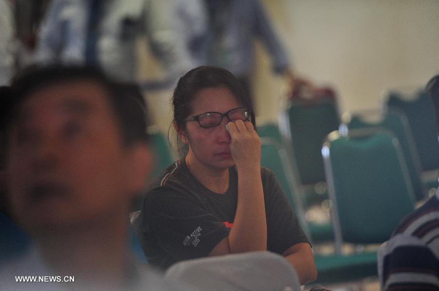 A woman wipes tears as family members of passengers on AirAsia Flight QZ8501 gather at Juanda International Airport in Surabaya, Indonesia, Dec. 29, 2014. Air Asia Indonesia has released information about the 162 passengers and crew members on Flight QZ8501, which lost contact with the air traffic control Sunday morning. (Xinhua/Zulkarnain)