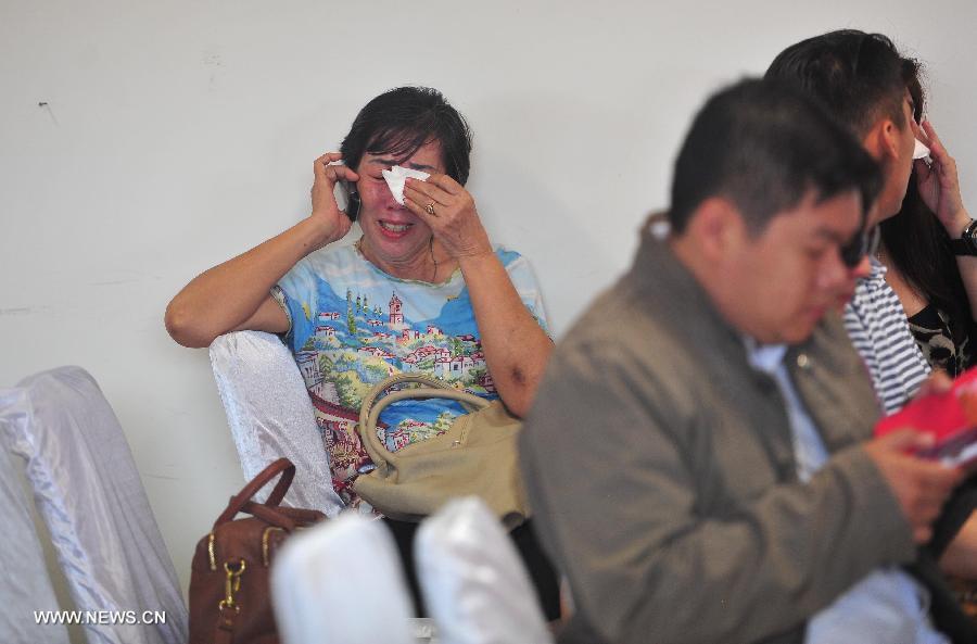 A woman wipes tears as family members of passengers on AirAsia Flight QZ8501 gather at Juanda International Airport in Surabaya, Indonesia, Dec. 29, 2014. Air Asia Indonesia has released information about the 162 passengers and crew members on Flight QZ8501, which lost contact with the air traffic control Sunday morning. (Xinhua/Zulkarnain)