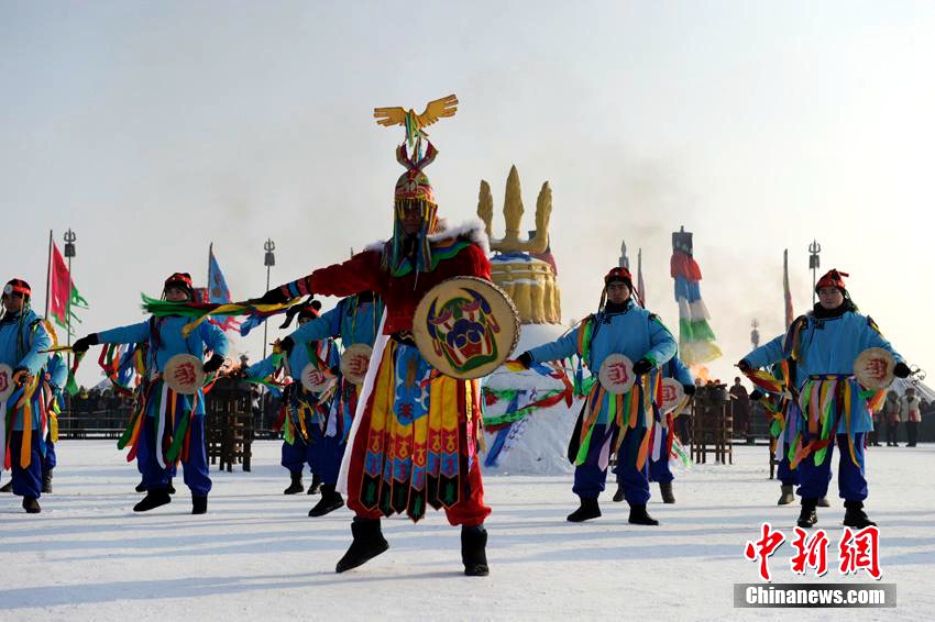 A ceremony of offering a sacrifice to the Lake God and waking up the fishing net is held at Chagan Lake in Songyuan city, northeast China's Jilin province, Dec. 28, 2014. Chagan Lake is the only area in China where traditional Mongolian ice fishing method is used. (CNS/ Zhang Yao)
