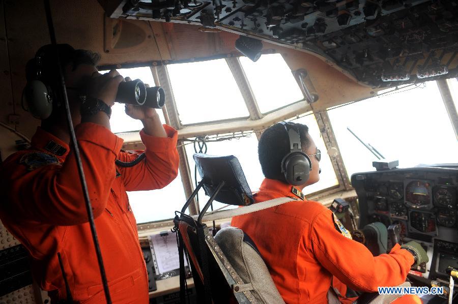 Indonesian air force personnel search for suspicious objects on the Hercules C-130 during a search operation of AirAsia Flight QZ8501 on the sea of the Karimata Strait, Indonesia, Dec. 29, 2014. Suspicious objects were detected on Monday in the Java Sea where an AirAsia plane disappeared as the search operation expanded with more countries joining the sea and aerial hunt. (Xinhua/Agung Kuncahya B.)