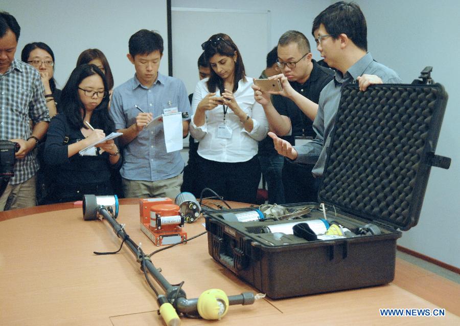 A rescue professional (1st R) from Singapore demonstrates the search and rescue equipment that will be used in the search for the missing AirAsia flight QZ8501 at Singapore's Changi Airport, on Dec. 29, 2014. The AirAsia flight QZ8501 scheduled to arrive at Changi Airport on Sunday lost contact with Indonesian air traffic control in Indonesian flight information region. Singapore has pledged support and will dispatch aircraft and equipment to support the search and rescue efforts in Indonesia. (Xinhua/Chen Jipeng)