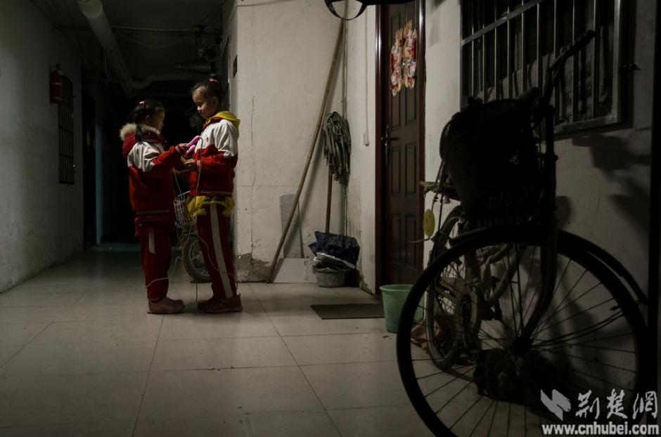 Yu Jingwen has lived with her parents in the basement for more than one year. She is in grade six this year and her litter sister is in grade three in the same school. They usually play games in hallway. (Photo/ cnhubei.com )