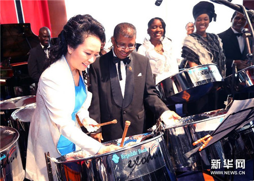 Peng Liyuan plays the steelpan in the Republic of Trinidad and Tobago on June 1, 2013.(Photo/Xinhua)