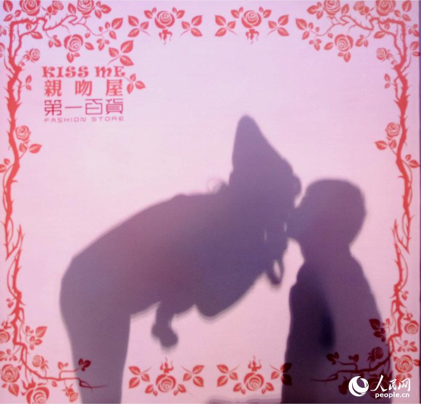 A "kissing room" opens to public for the first time in front of the No.1 Shopping Mall in Jinhua, Zhejiang province on Dec. 20, 2014. Lovers may kiss each other following the music in the room, with people enjoying their sketch outside at the same time. The activity aroused love in peoples’ heart.(Photo source: CFP)