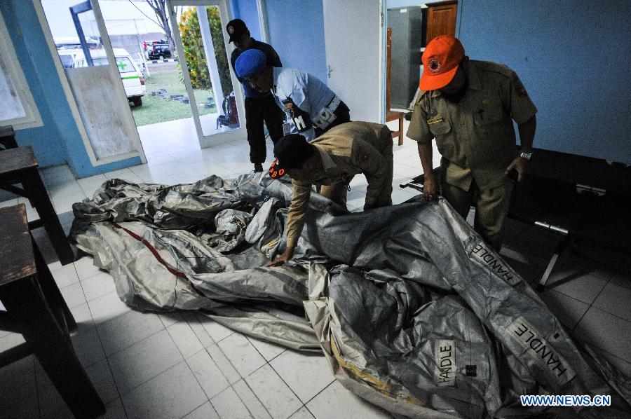 | Officers display an object suspected as belongings of AirAsia QZ8501 that found on the sea of Karimata at Pangkalan Bun airport, Central Kalimantan province, Indonesia, on Dec. 30, 2014. Indonesian authorities have confirmed that the objects and corpses spotted are from the missing AirAsia plane and they will be brought to Pangkalan Aju in Pangkalan Bun of Central Kalimantan province, the nearest place to the location of the finding. (Xinhua/Veri Sanovri) |