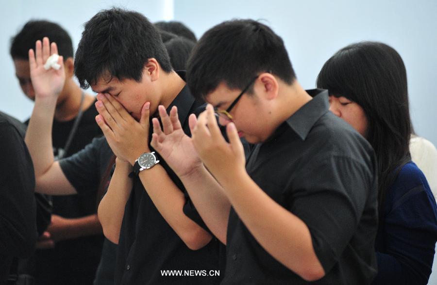 Relatives of people on Indonesia AirAsia's flight QZ8501 pray together at Juanda International Airport in Surabaya, Indonesia, Dec. 31, 2014. Indonesian rescuers searching for the missing AirAsia plane have spotted six bodies and recovered three from waters off the southern coast of Kalimantan island, shortly after they observed floating debris later confirmed to be from the ill-fated plane. (Xinhua/Zulkarnain)