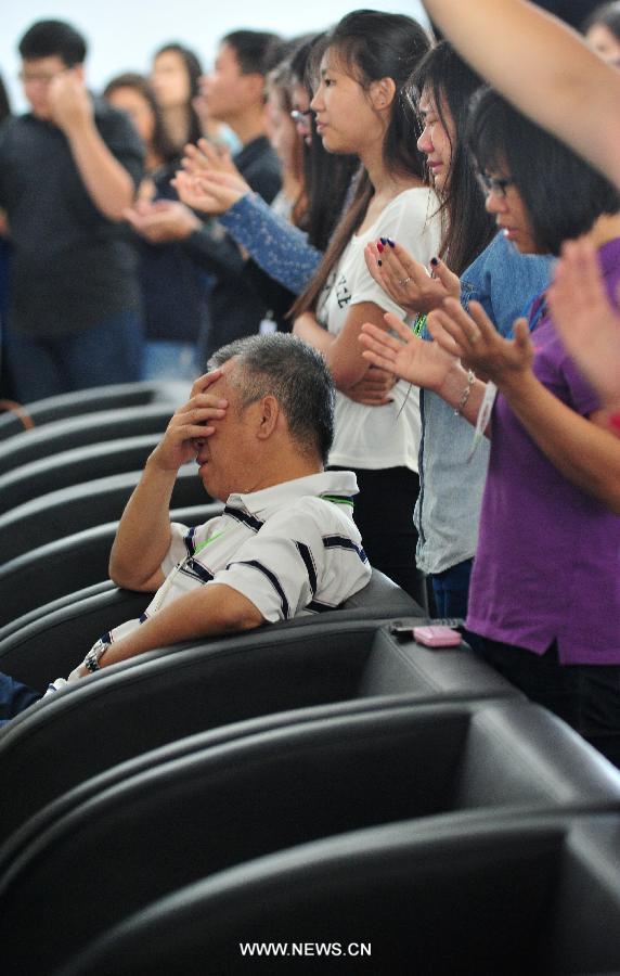 Relatives of people on Indonesia AirAsia's flight QZ8501 pray together at Juanda International Airport in Surabaya, Indonesia, Dec. 31, 2014. Indonesian rescuers searching for the missing AirAsia plane have spotted six bodies and recovered three from waters off the southern coast of Kalimantan island, shortly after they observed floating debris later confirmed to be from the ill-fated plane. (Xinhua/Zulkarnain)