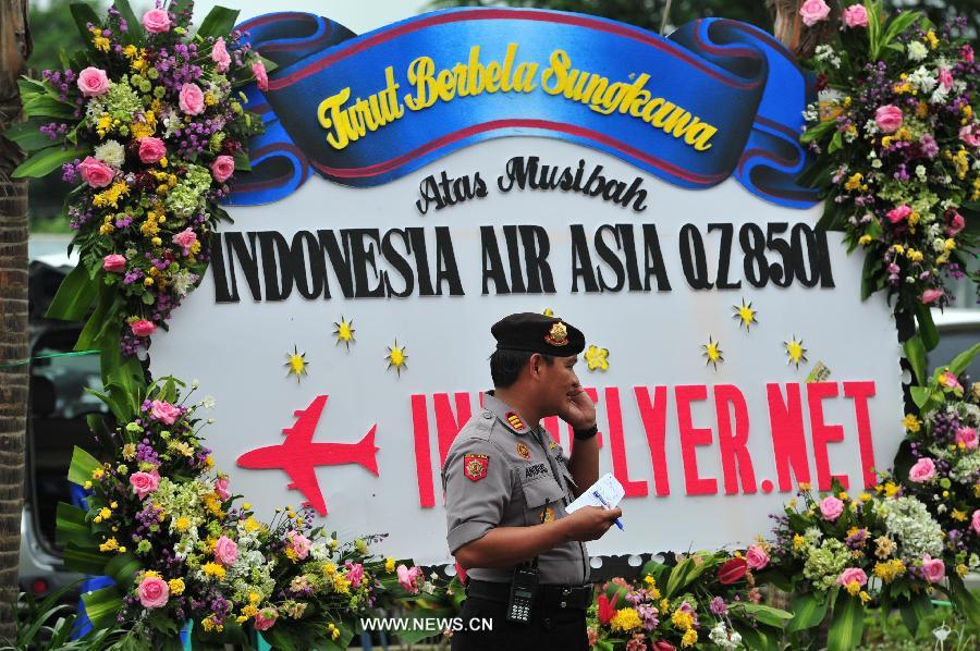 | An Indonesian policeman walks past condolence sign for people on Indonesia AirAsia's flight QZ8501 at Juanda International Airport in Surabaya, Indonesia, Dec. 31, 2014. Indonesian rescuers searching for the missing AirAsia plane have spotted six bodies and recovered three from waters off the southern coast of Kalimantan island, shortly after they observed floating debris later confirmed to be from the ill-fated plane. (Xinhua/Zulkarnain) |