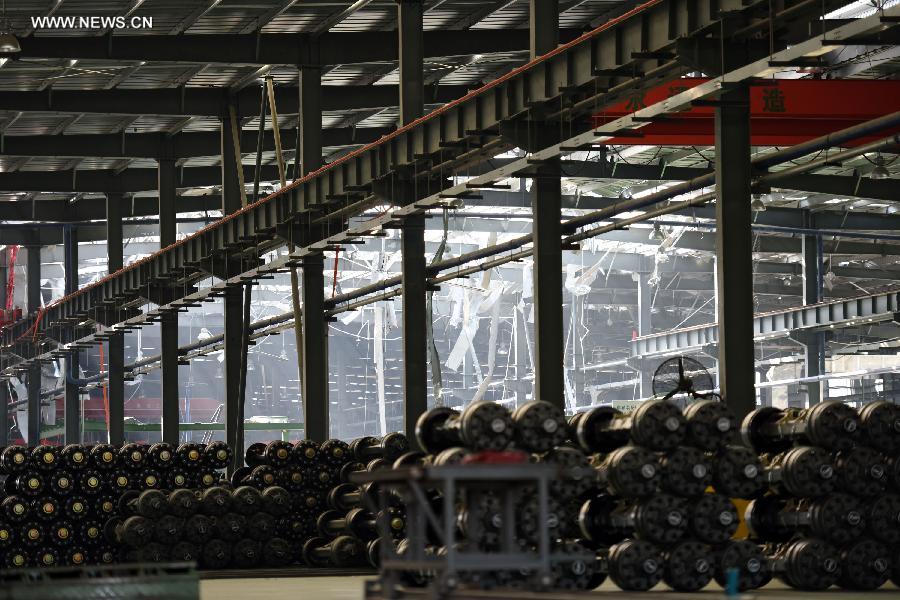 The ceiling is broken after a gas blast rocked a plant of the Fuwa Engineering Manufacturing Co. Ltd. in the Shunde District of the industrial city of Foshan, south China's Guangdong Province, Dec. 31, 2014. Seventeen people were killed and 33 others were injured in the accident which occurred on Wednesday morning. (Xinhua/Liang Xu)