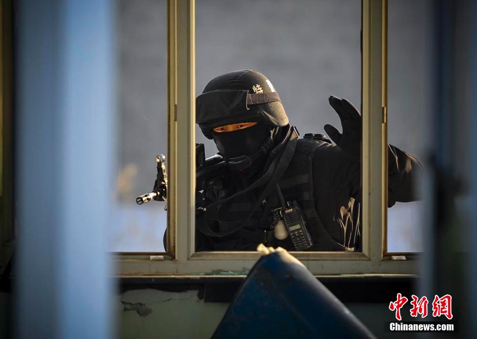 A SWAT team holds an anti-hijacking drill in Urumqi, northwest China’s Xinjiang Uygur Autonomous Region on Dec. 29, 2014. “Gangsters” hijacked several “hostages” with guns and knives and hid in a deserted factory. The SWAT members blitzed on “hijackers” and rescued the “hostages” rapidly. (Chinanews/Fang Tao)