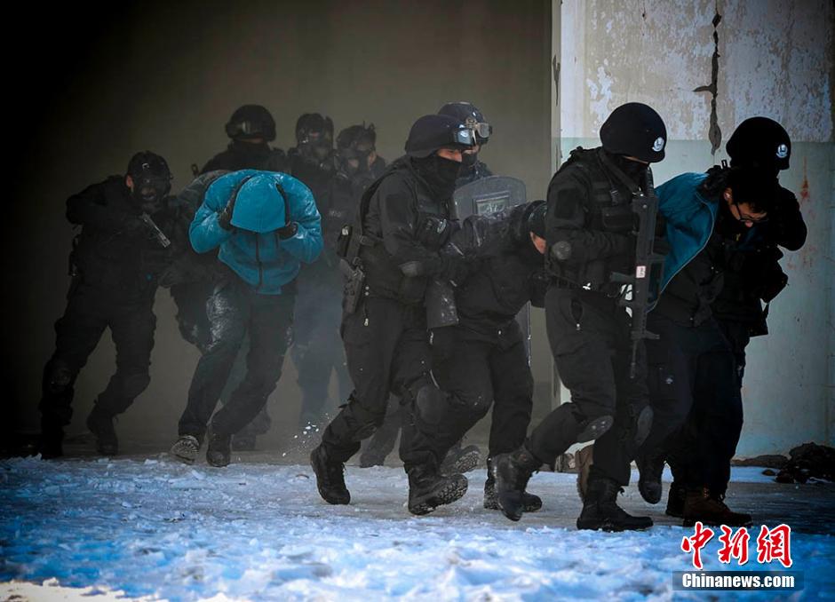 | A SWAT team holds an anti-hijacking drill in Urumqi, northwest China’s Xinjiang Uygur Autonomous Region on Dec. 29, 2014. “Gangsters” hijacked several “hostages” with guns and knives and hid in a deserted factory. The SWAT members blitzed on “hijackers” and rescued the “hostages” rapidly. (Chinanews/Fang Tao) |