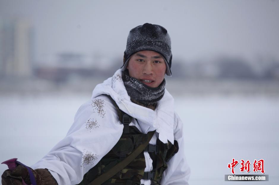 Soldiers of one frontier defense regiment in Heihe conduct skiing patrol under temperature of minus 25 degrees Celsius on Dec. 29, 2014. They also increased monitoring strength through various ways like video surveillance, mounted patrol and skiing patrol to secure border stability.(Chinanews/Wei Jianshun)