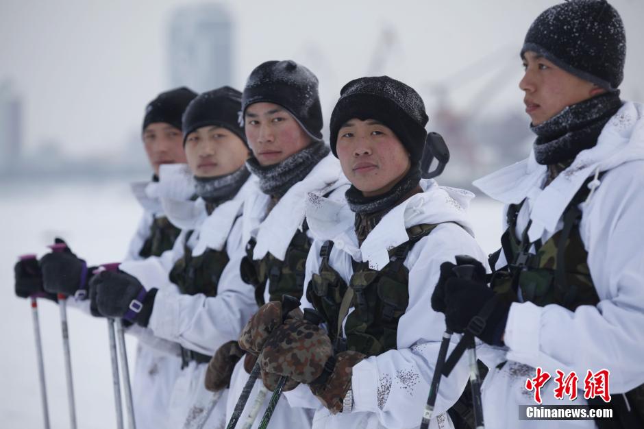Soldiers of one frontier defense regiment in Heihe conduct skiing patrol under temperature of minus 25 degrees Celsius on Dec. 29, 2014. They also increased monitoring strength through various ways like video surveillance, mounted patrol and skiing patrol to secure border stability.(Chinanews/Wei Jianshun)