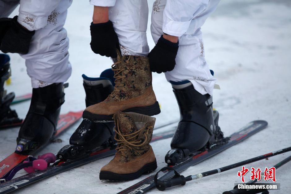 Soldiers of one frontier defense regiment in Heihe conduct skiing patrol under temperature of minus 25 degrees Celsius on Dec. 29, 2014. They also increased monitoring strength through various ways like video surveillance, mounted patrol and skiing patrol to secure border stability.(Chinanews/Wei Jianshun)