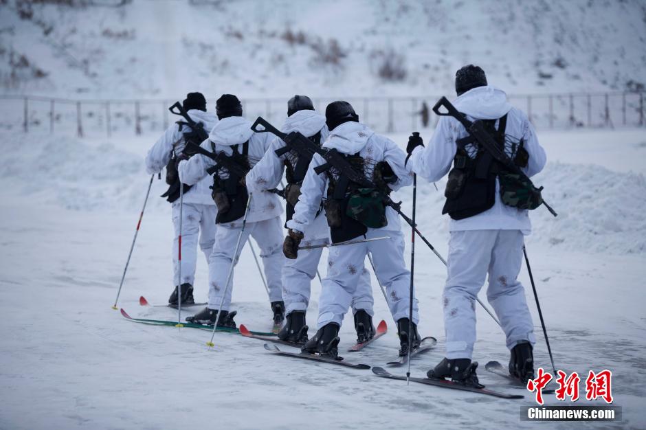 Soldiers of one frontier defense regiment in Heihe conduct skiing patrol under temperature of minus 25 degrees Celsius on Dec. 29, 2014. They also increased monitoring strength through various ways like video surveillance, mounted patrol and skiing patrol to secure border stability.(Chinanews/Wei Jianshun)