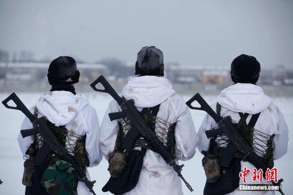 Soldiers of one frontier defense regiment in Heihe conduct skiing patrol under temperature of minus 25 degrees Celsius on Dec. 29, 2014. They also increased monitoring strength through various ways like video surveillance, mounted patrol and skiing patrol to secure border stability.(Chinanews/Wei Jianshun)