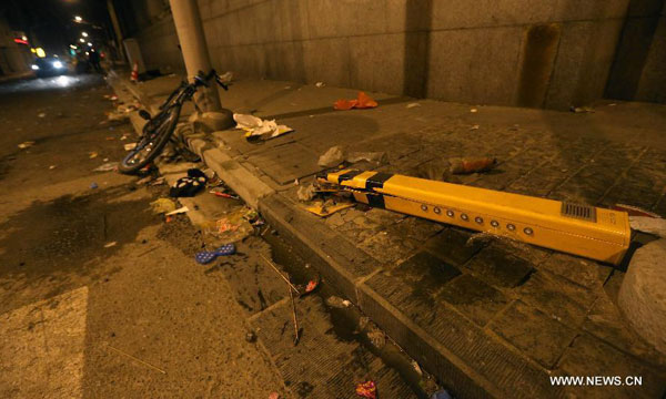| This photo taken on the early hours of Jan. 1, 2015 shows the scene of a stampede that caused casualties among people who took part in new year celebrations in east China's Shanghai. New Year celebrations in the bund area went astray early Thursday morning as a stampede resulted in casualties in east China's Shanghai. The injured people have been set to the No. 1 People's Hospital of Shanghai. (Xinhua/Ding Ting) |