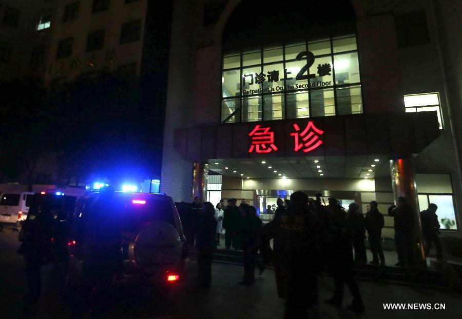 Medical workers are seen outside the emergency ward of the No. 1 People's Hospital of Shanghai after a stampede caused casualties among people who took part in new year celebrations in east China's Shanghai, early on Jan. 1, 2015. New Year celebrations in the bund area went astray early Thursday morning as a stampede resulted in casualties in east China's Shanghai. The injured people have been set to the No. 1 People's Hospital of Shanghai. (Xinhua/Ding Ting)