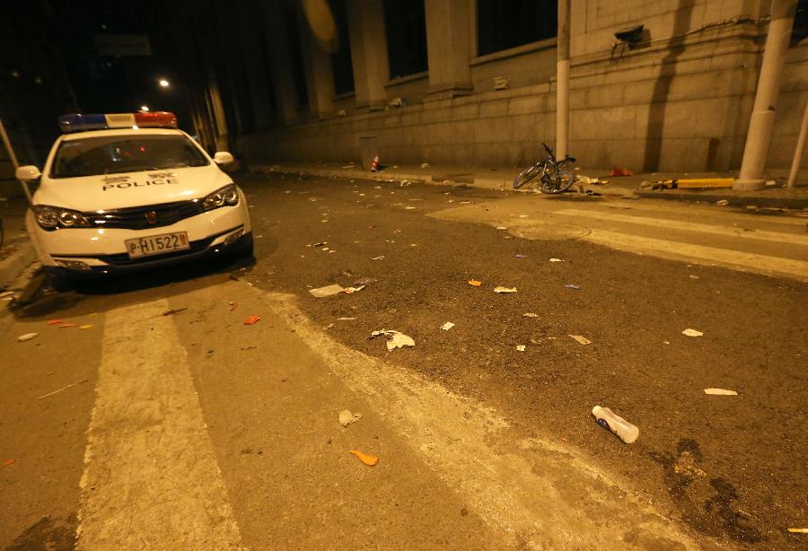 Photo taken on Jan. 1, 2015 shows the scene of a stampede that caused casualties among people who took part in new year celebrations in east China's Shanghai. New Year celebrations in Shanghai's bund area went astray Wednesday night as a stampede resulted in 35 people dead and 42 injured. A witness said that some coupons that looked like "dollar bill" were thrown from a building's third-floor window near the Bund and people standing along the river bank started to scramble for these coupons. The city has set up a working team for rescue operations and to deal with the aftermath. (Xinhua/Ding Ting)