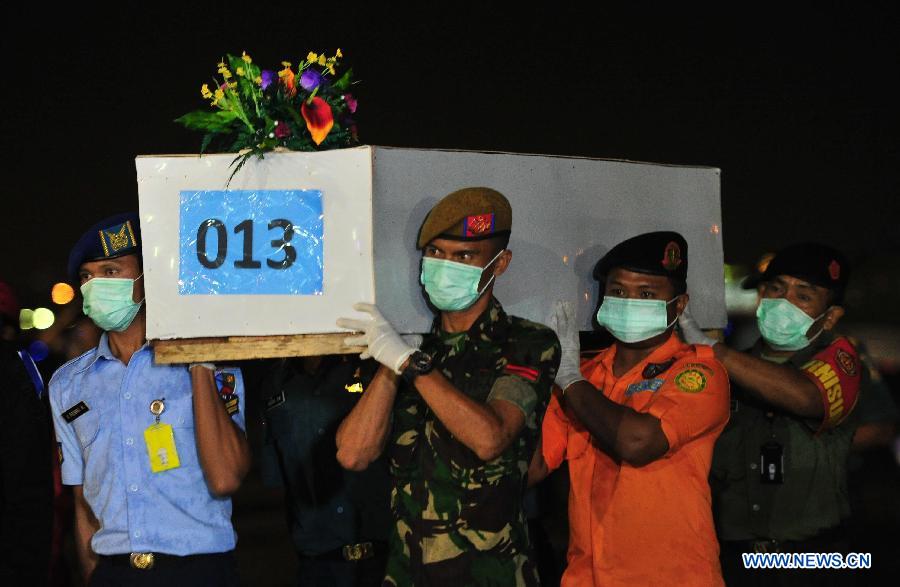 Indonesian soldiers carry a coffin containing victim of AirAsia flight QZ8501 at Juanda Naval Air Base in Surabaya, Indonesia, Jan. 2, 2015. (Xinhua/Zulkarnain)