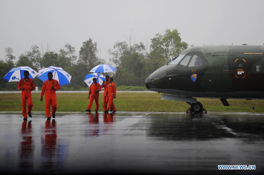 | Indonesian air force pilots hold umbrellas during heavy rain while their plane is canceled to fly at Pangkalan Bun, Indonesia, Jan. 4, 2015. The search and rescue team has yet to find the black boxes of crashed AirAsia flight QZ8501 as bad weather still lingers in the crash site, an Indonesian official said here Saturday. (Xinhua/Agung Kuncahya B.) |